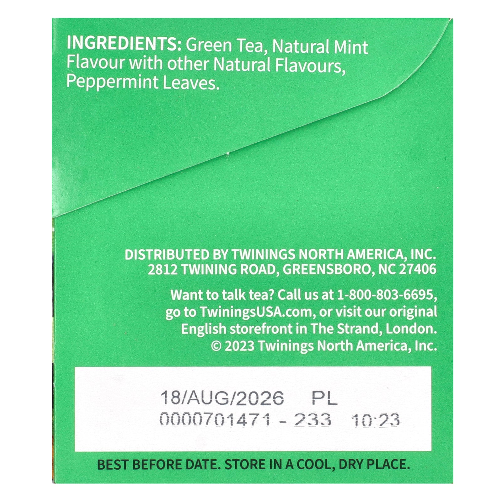 Green tea, natural mint flavor with other natural flavors, peppermint leaves.
