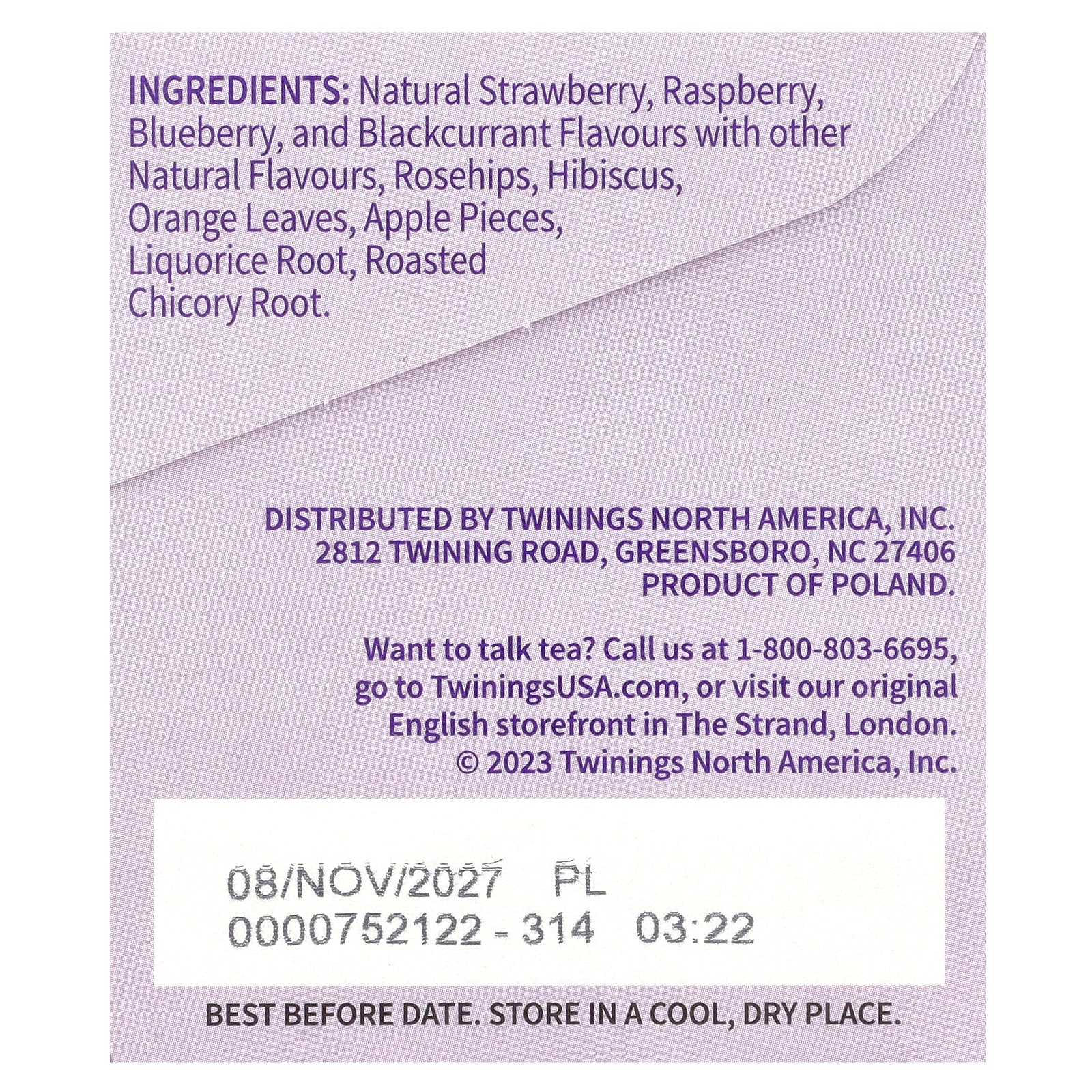 Natural strawberry, raspberry, blueberry, and blackcurrant flavours with other natural flavours, rosehips, hibiscus, orange leaves, apple pieces, liquorice root, roasted chicory root.