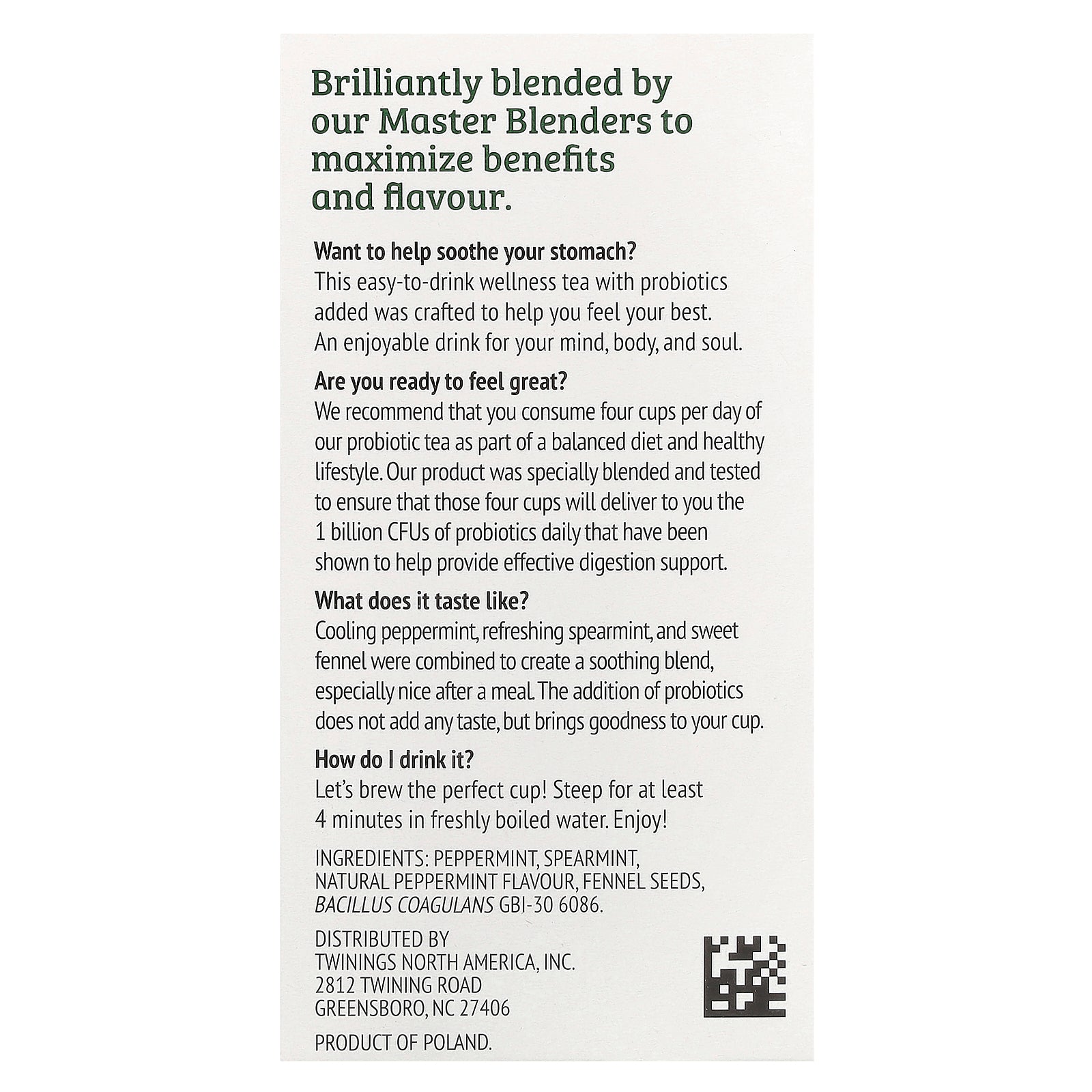 Cooling peppermint, refreshing spearmint, and sweet fennel were combined to create a soothing blend, especially nice after a meal. The addition of probiotics does not add any taste, but brings goodness to your cup.