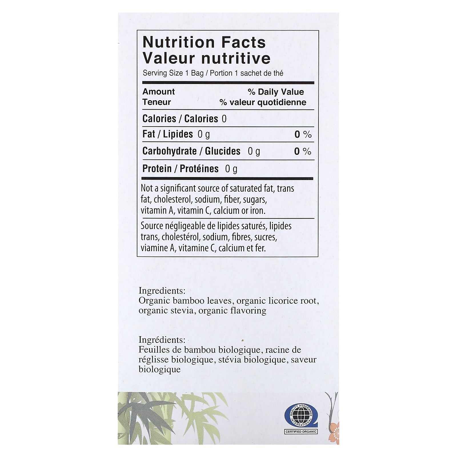 Organic bamboo leaves, organic licorice root, organic stevia, organic flavoring.