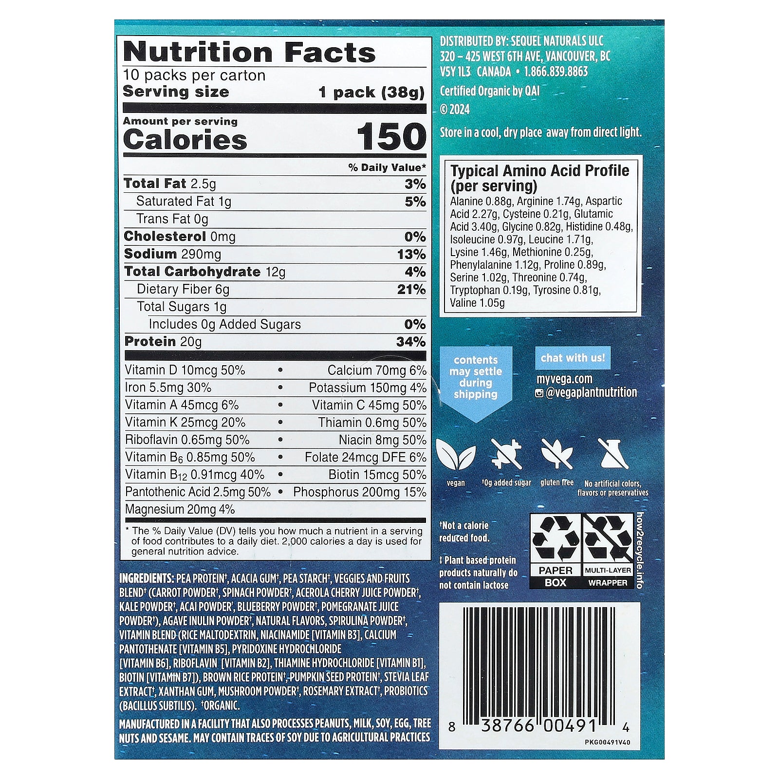 Pea protein*, acacia gum*, pea starch*, veggies and fruits blend* (carrot powder*, spinach powder*, acerola cherry juice powder*, kale powder*, acai powder*, blueberry powder*, pomegranate juice powder*), agave inulin powder*, natural flavors, spirulina powder*, vitamin blend (rice maltodextrin, niacinamide [vitamin B3], calcium pantothenate [vitamin B5], pyridoxine hydrochloride [vitamin B6], riboflavin [vitamin B2], thiamine hydrochloride [vitamin B1], biotin [vitamin B7]), brown rice protein*, pumpkin seed protein*, stevia leaf extract*, xanthan gum, mushroom powder*, rosemary extract*, probiotics (bacillus subtilis).