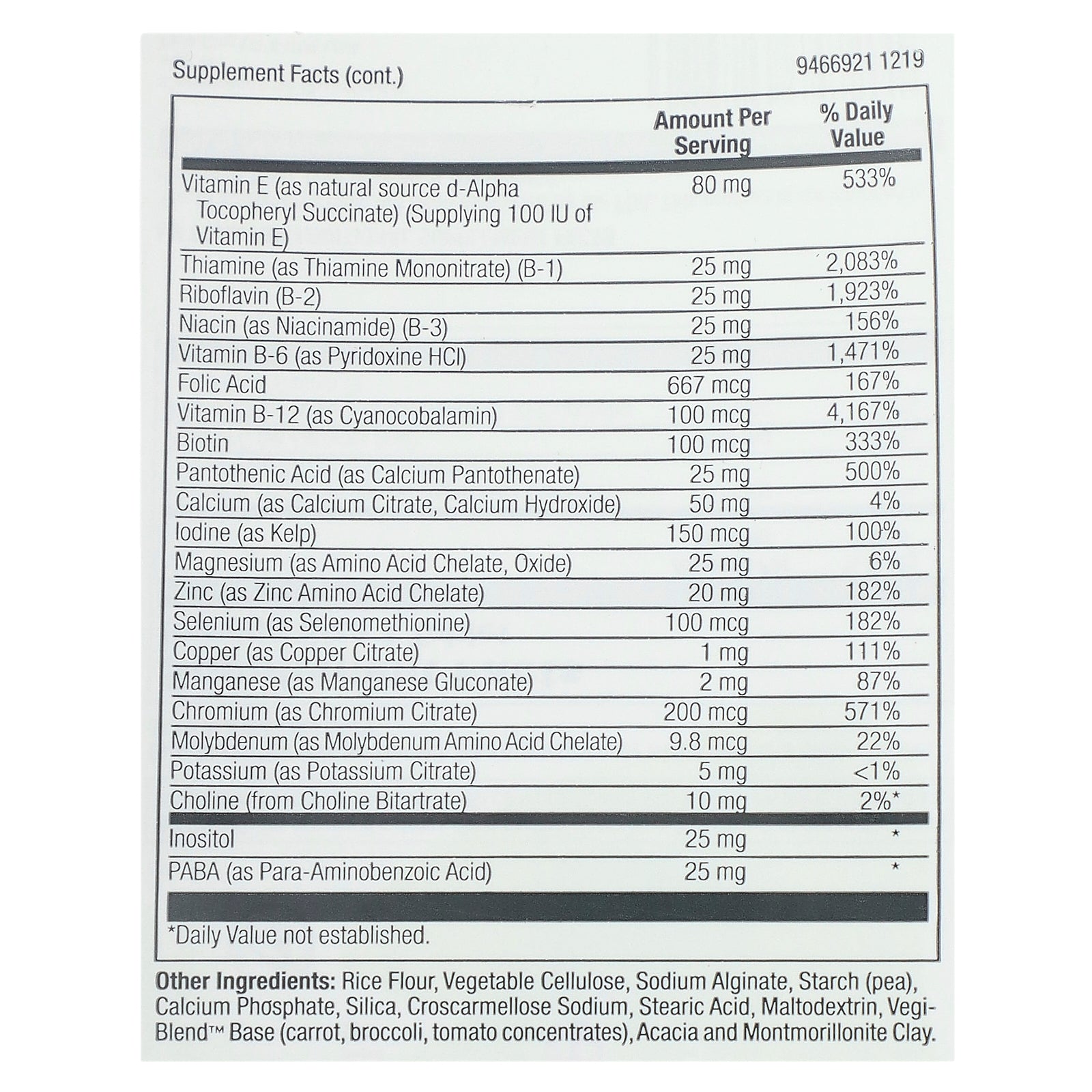 Rice flour, vegetable cellulose, sodium alginate, starch (pea), calcium phosphate, silica, croscarmellose sodium, stearic acid, maltodextrin, VegiBlend™ base (carrot, broccoli, tomato concentrates), acacia and montmorillonite clay.
