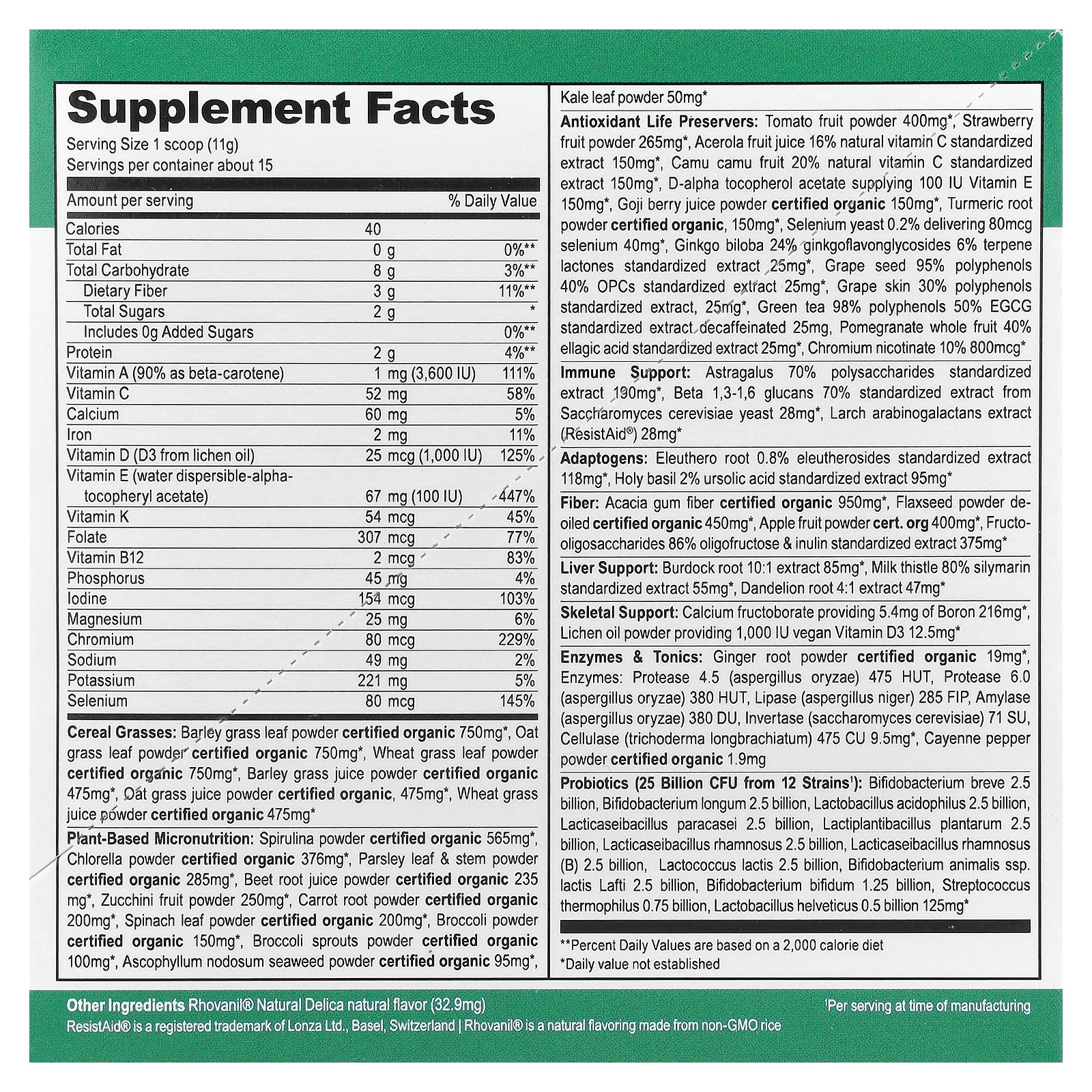 | Vitamin D (D3 from lichen oil) | 25 mcg (1,000 IU) | 125% |