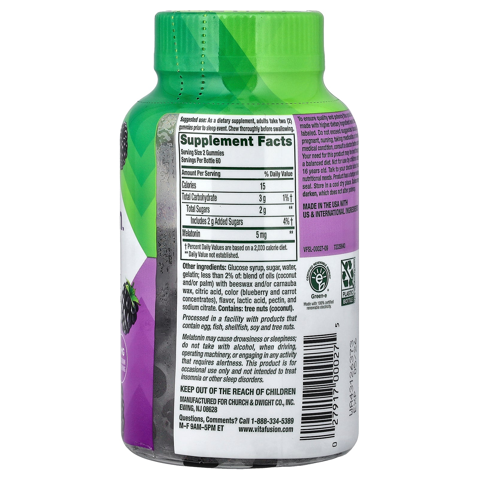With all you do every day, you look forward to a good night's sleep. These vitafusion™ gummies combine a delicious blackberry flavor and 5 mg of melatonin per serving to support the sleep of your dreams. Wake up refreshed and ready to take on the day.