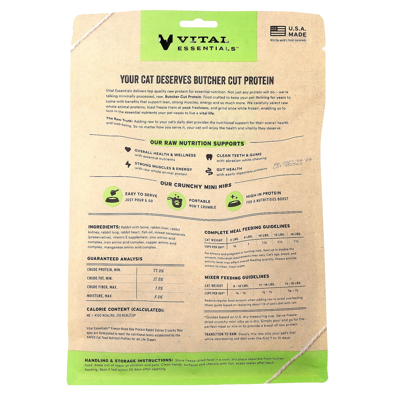 Vital Essentials™ Freeze-Dried Raw Protein Rabbit Entree Crunchy Mini Nibs are formulated to meet the nutritional levels established by the AAFCO Cat Food Nutrient Profiles for All Life Stages.