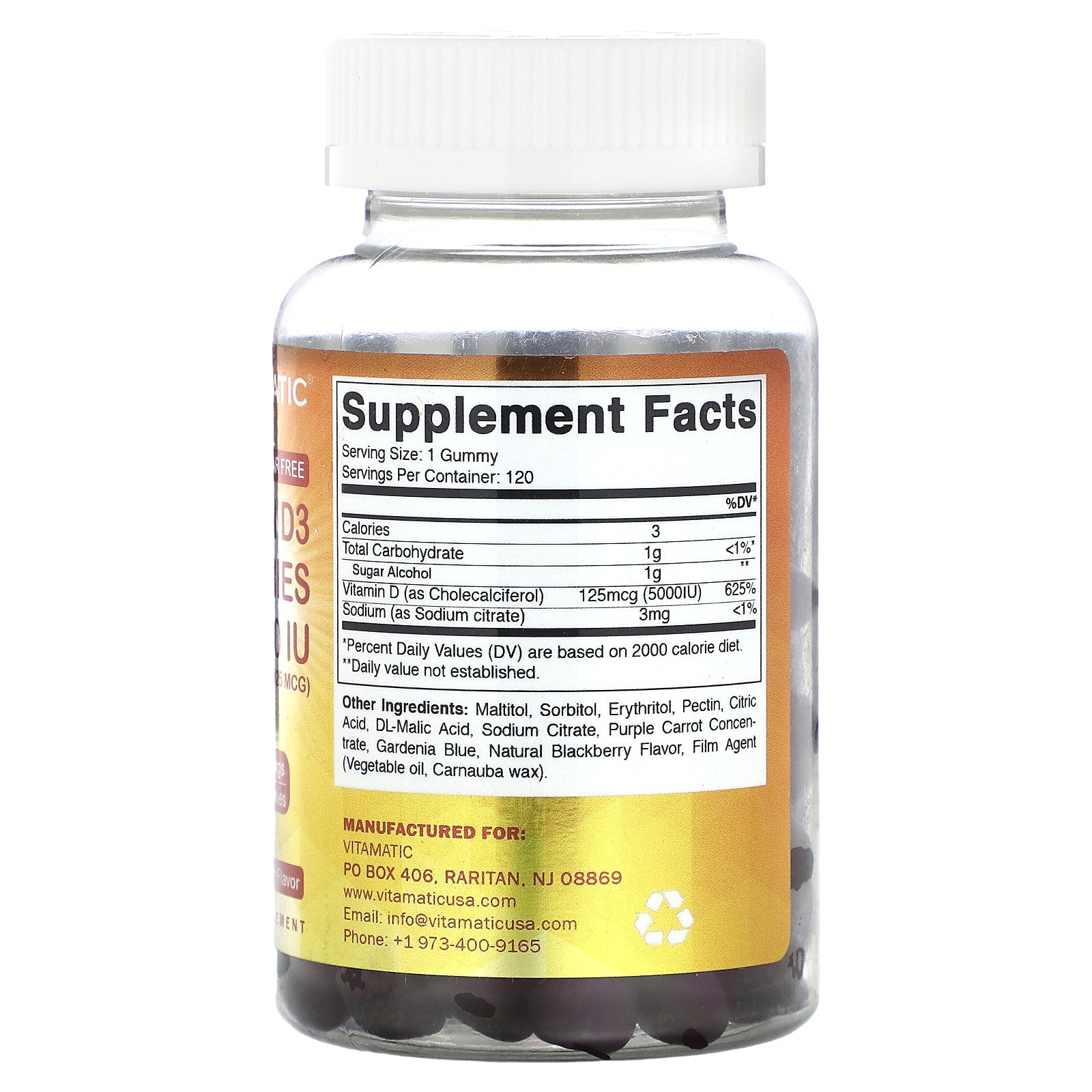 Vitamatic, Sugar Free Vitamin D3 Gummies, Natural Blackberry, 125 mcg (5,000 IU ), 120 Gummies