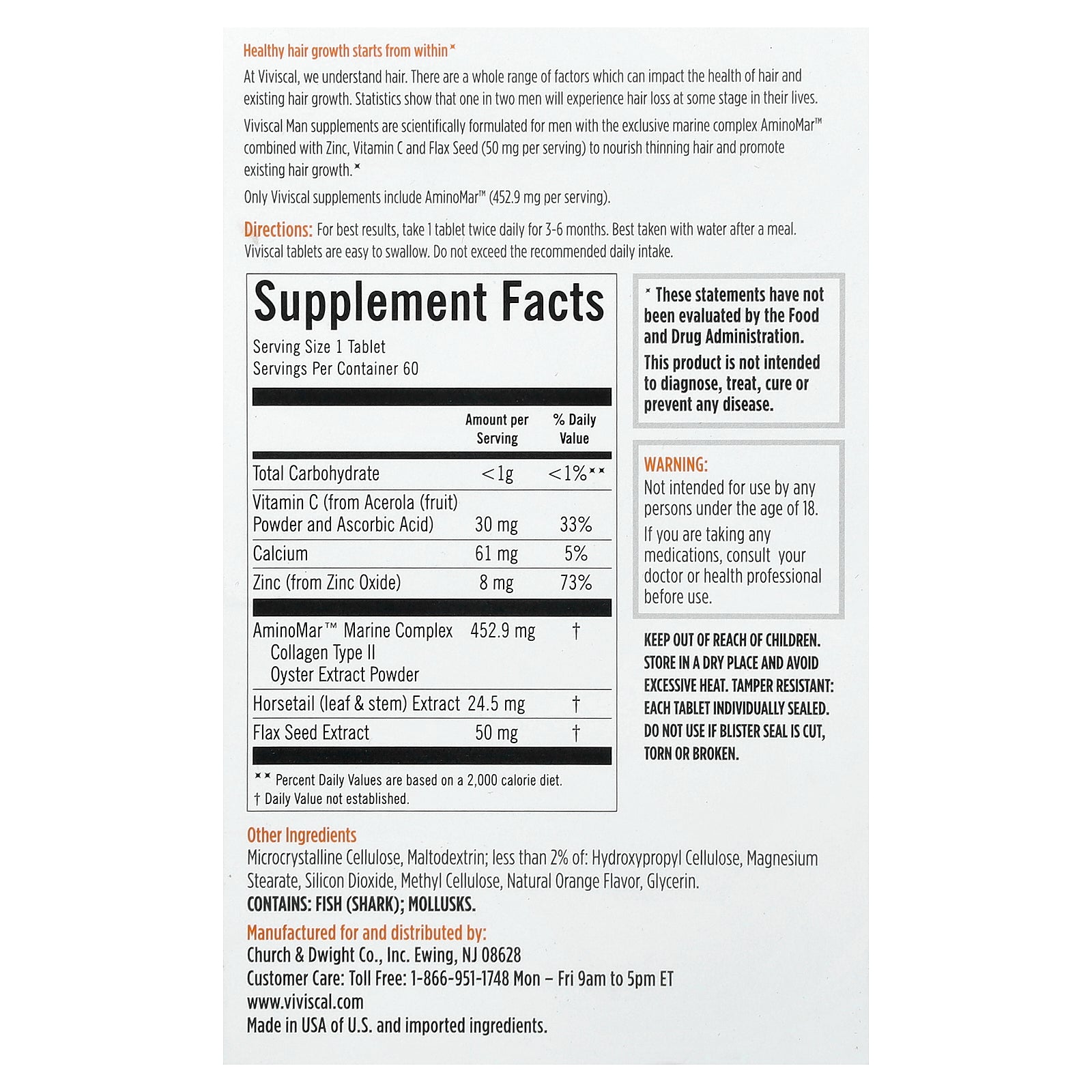 At Viviscal, we understand hair. There are a whole range of factors which can impact the health of hair and existing hair growth. Statistics show that one in two men will experience hair loss at some stage in their lives. Viviscal Man supplements are scientifically formulated for men with the exclusive marine complex AminoMar™ combined with Zinc, Vitamin C and Flax Seed (50 mg per serving) to nourish thinning hair and promote existing hair growth.