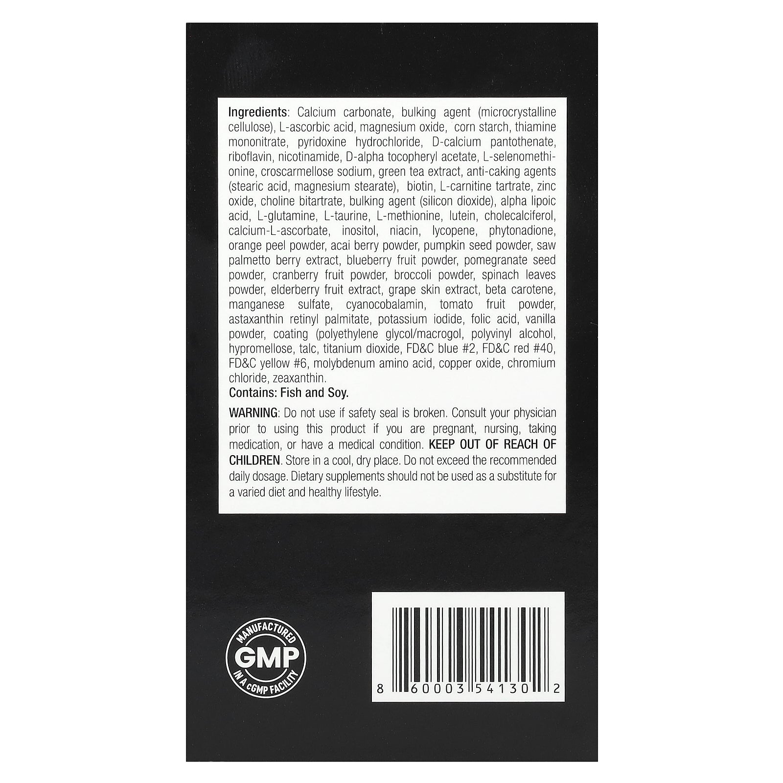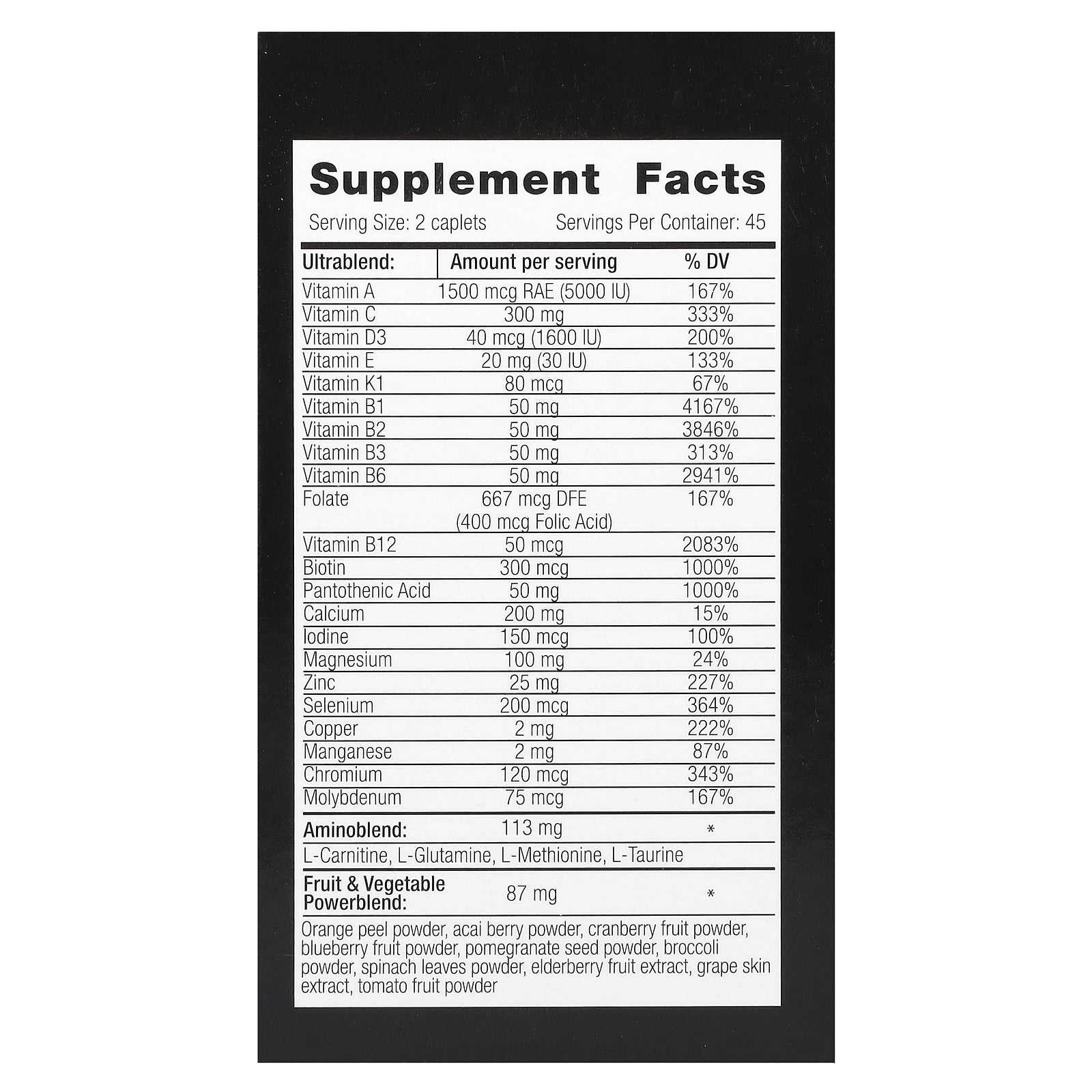 Calcium carbonate, bulking agent (microcrystalline cellulose), l-ascorbic acid, magnesium oxide, corn starch, thiamine mononitrate, pyridoxine hydrochloride, d-calcium pantothenate, riboflavin, nicotinamide, d-alpha tocopheryl acetate, l-selenomethionine, croscarmellose sodium, green tea extract, anti-caking agents (stearic acid, magnesium stearate), biotin, l-carnitine tartrate, zinc oxide, choline bitartrate, bulking agent (silicon dioxide), alpha lipoic acid, l-glutamine, l-taurine, l-methionine, lutein, cholecalciferol, calcium-l-ascorbate, inositol, niacin, lycopene, phytonadione, orange peel powder, acacia berry powder, pumpkin seed powder, saw palmetto berry extract, blueberry fruit powder, pomegranate seed powder, cranberry fruit powder, broccoli powder, spinach leaves powder, elderberry fruit extract, grape skin extract, beta carotene, manganese sulfate, cyanocobalamin, tomato fruit powder, astaxanthin retinyl palmitate, potassium iodide, folic acid, vanilla powder, coating (polyethylene glycol/macrogol, polyvinyl alcohol, hypromellose, talc, titanium dioxide, fd&c blue #2, fd&c red #40, fd&c yellow #6, molybdenum amino acid, copper oxide, chromium chloride, zeaxanthin.