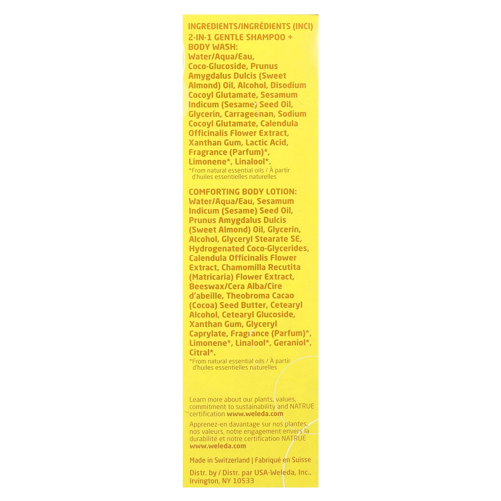2-in-1 Gentle Shampoo + Body Wash: Water, coco-glucoside, prunus amygdalus dulcis (sweet almond) oil, alcohol, disodium cocoyl glutamate, sesamum indicum (sesame) seed oil, glycerin, carrageenan, sodium cocoyl glutamate, calendula officinalis flower extract, xanthan gum, lactic acid, fragrance*, limonene*, linalool*.