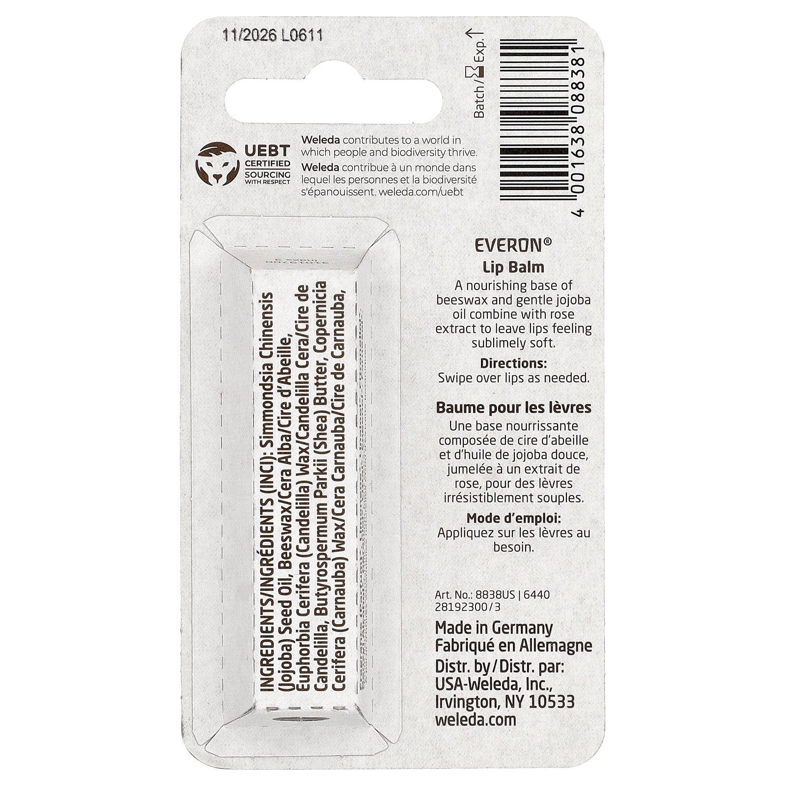 Simmondsia chinensis (jojoba) seed oil, beeswax, euphorbia cerifera (candelilla) wax, butyrospermum parkii (shea) butter, copernicia cerifera (carnauba) wax, fragrance (parfum)*, limonene*, linalool*, citronellol*, benzyl alcohol*, geraniol*, citral*, eugenol*, farnesol*.