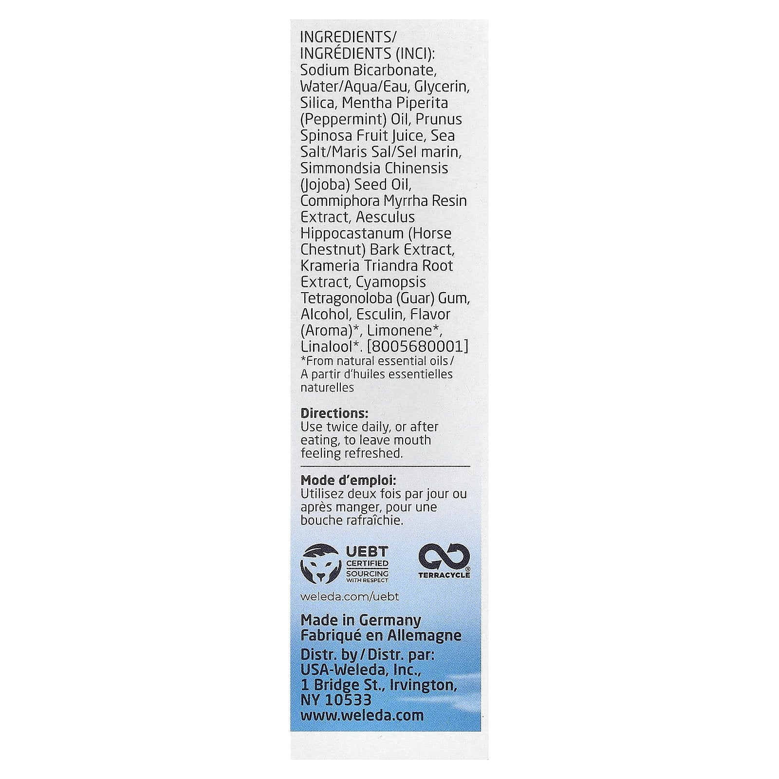 Sodium bicarbonate, water, glycerin, silica, mentha piperita (peppermint) oil, prunus spinosa fruit juice, sea salt/maris sal/sel marin, simmondsia chinensis (jojoba) seed oil, commiphora myrrha resin extract, aesculus hippocastanum (horse chestnut) bark extract, krameria triandra root extract, cyamopsis tetragonoloba (guar) gum, alcohol, esculin, flavor (aroma)*, limonene*, linalool*.