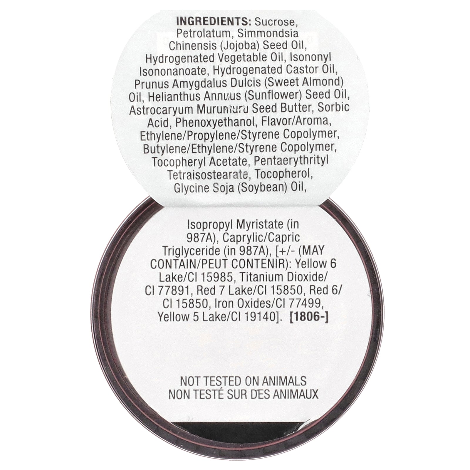 Sucrose, petrolatum, simmondsia chinensis (jojoba) seed oil, hydrogenated vegetable oil, isononyl isononanoate, hydrogenated castor oil, prunus amygdalus dulcis (sweet almond) oil, helianthus annuus (sunflower) seed oil, astrocaryum murumuru seed butter, sorbic acid, phenoxyethanol, flavor/aroma, ethylene/propylene/styrene copolymer, butylene/ethylene/styrene copolymer, tocopheryl acetate, pentaerythrityl tetraisostearate, tocopherol, glycine soja (soybean) oil, isopropyl myristate (in 987A), caprylic/capric triglyceride (in 987A), [+/- May contain: yellow 6 lake/ci 15985, titanium dioxide/ci 77891, red 7 lake/ci 15850, red 6/ci 15850, iron oxides/ci 77499, yellow 5 lake/ci 19140].