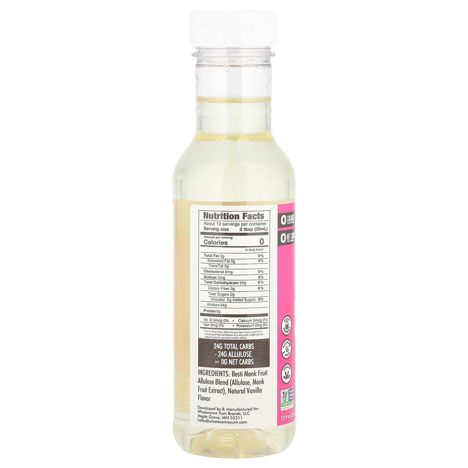 Meet Wholesome Yum Sugar Free Coffee Syrup: it’s the best way to sweeten coffee and other drinks, with 0 calories and 0 net carbs. This skinny syrup is naturally sweetened with Besti (a blend of monk fruit and allulose) and contains no artificial flavors, colors or additives.