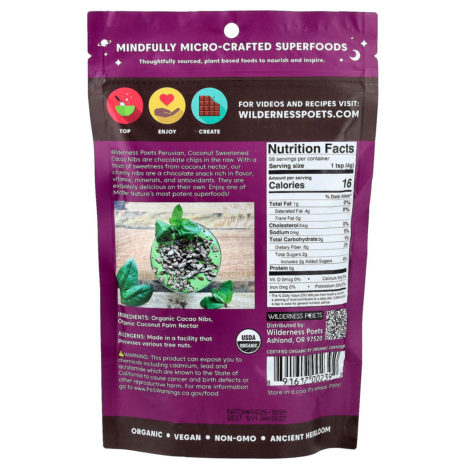 Organic cacao nibs, organic coconut palm nectar.