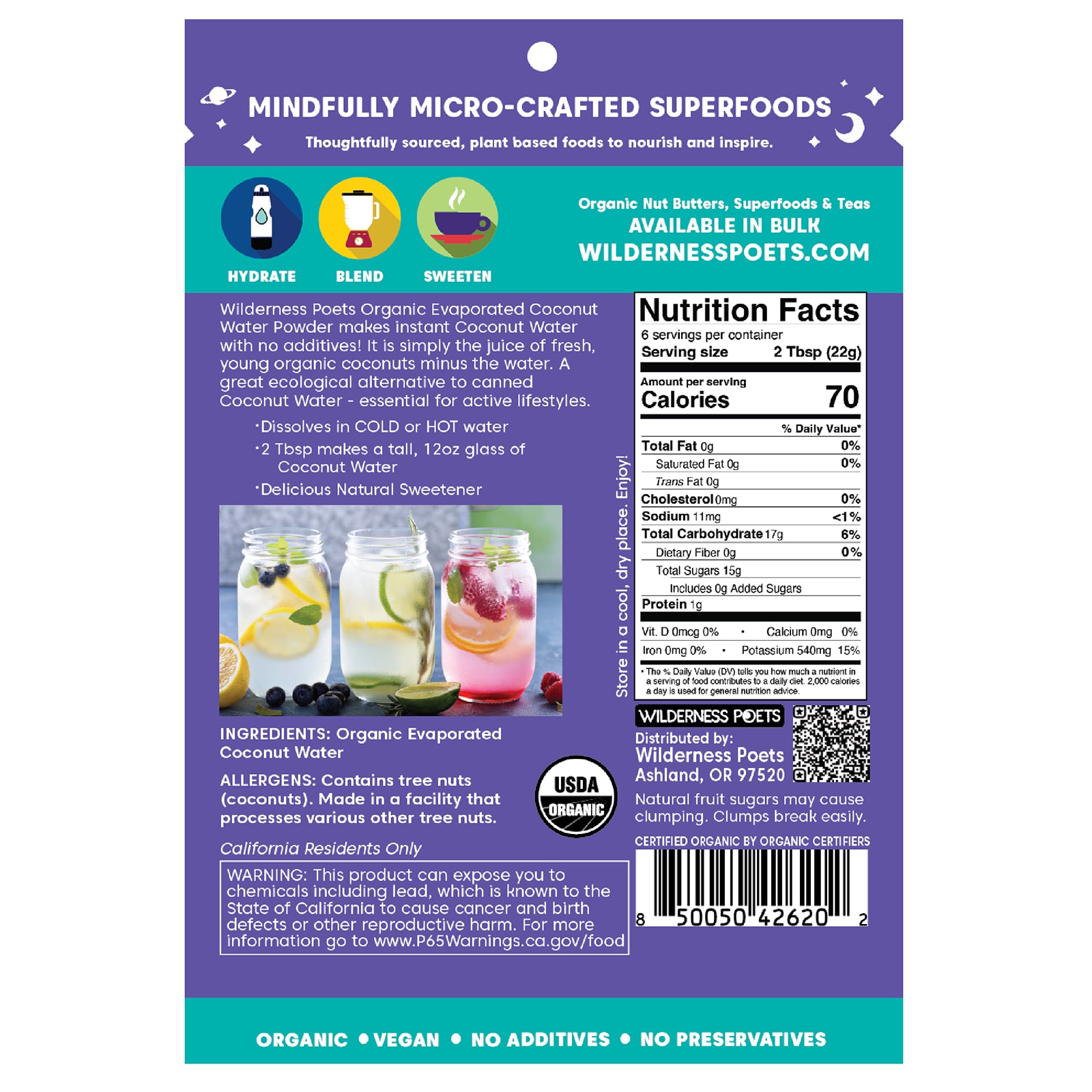 Coconut Water naturally hydrates, energizes and replenishes electrolytes, as it contains potassium, magnesium and phosphorus, essential nutrients to support active lifestyles and post workout recovery. Instant Coconut Water Powder is a great ecological alternative to canned Coconut Water - light as a feather and ready to go when you are!