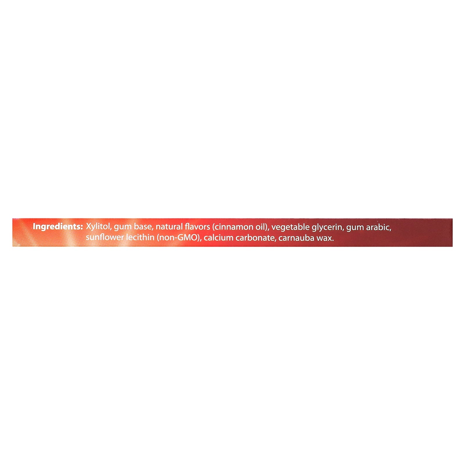 Xylitol, gum base, natural flavors (cinnamon oil), vegetable glycerin, gum arabic, sunflower lecithin (non-GMO), calcium carbonate, carnauba wax.