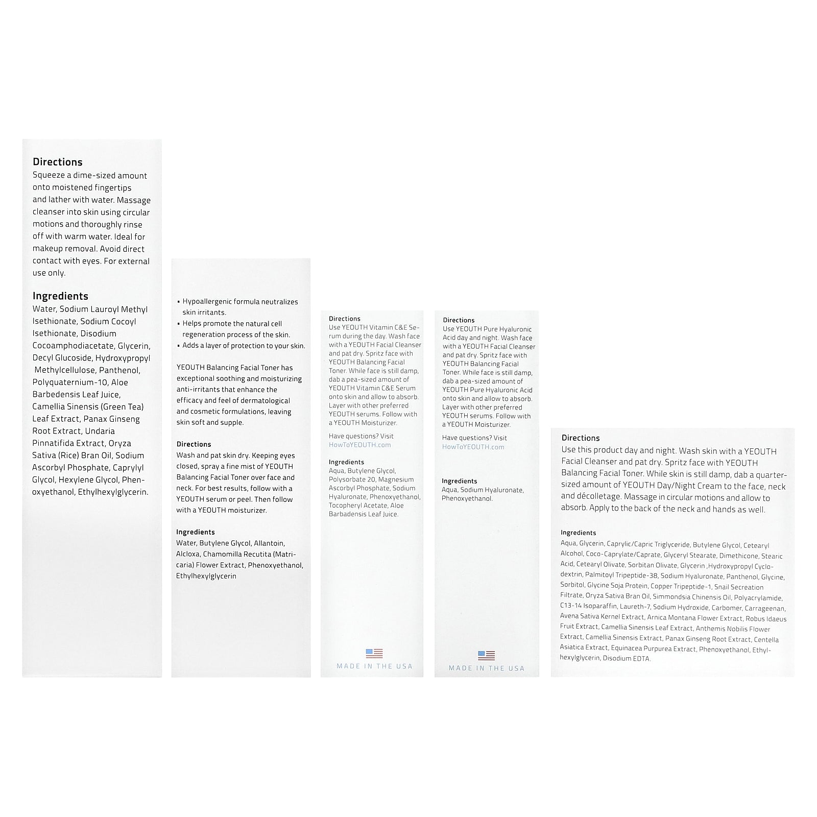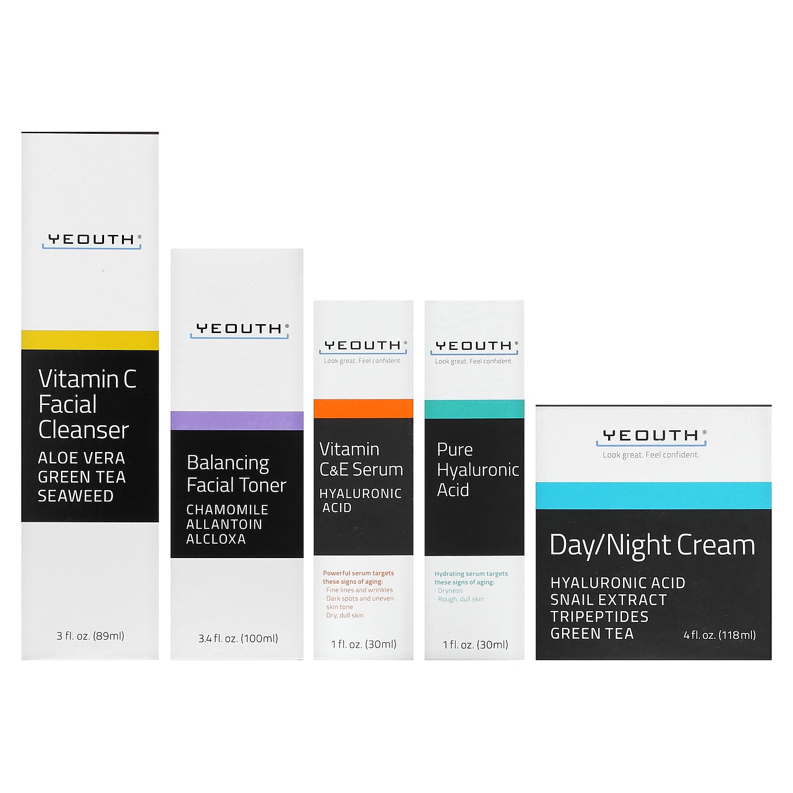 All YEOUTH products contain stable, high-quality, clinically tested ingredients engineered to work in cooperation with one another. While every pro- duct is developed to improve the appearance of skin, each does so via different methods. Using YEOUTH products together multiplies effective- ness and can enhance skin appearance by delivering dramatically visible results.