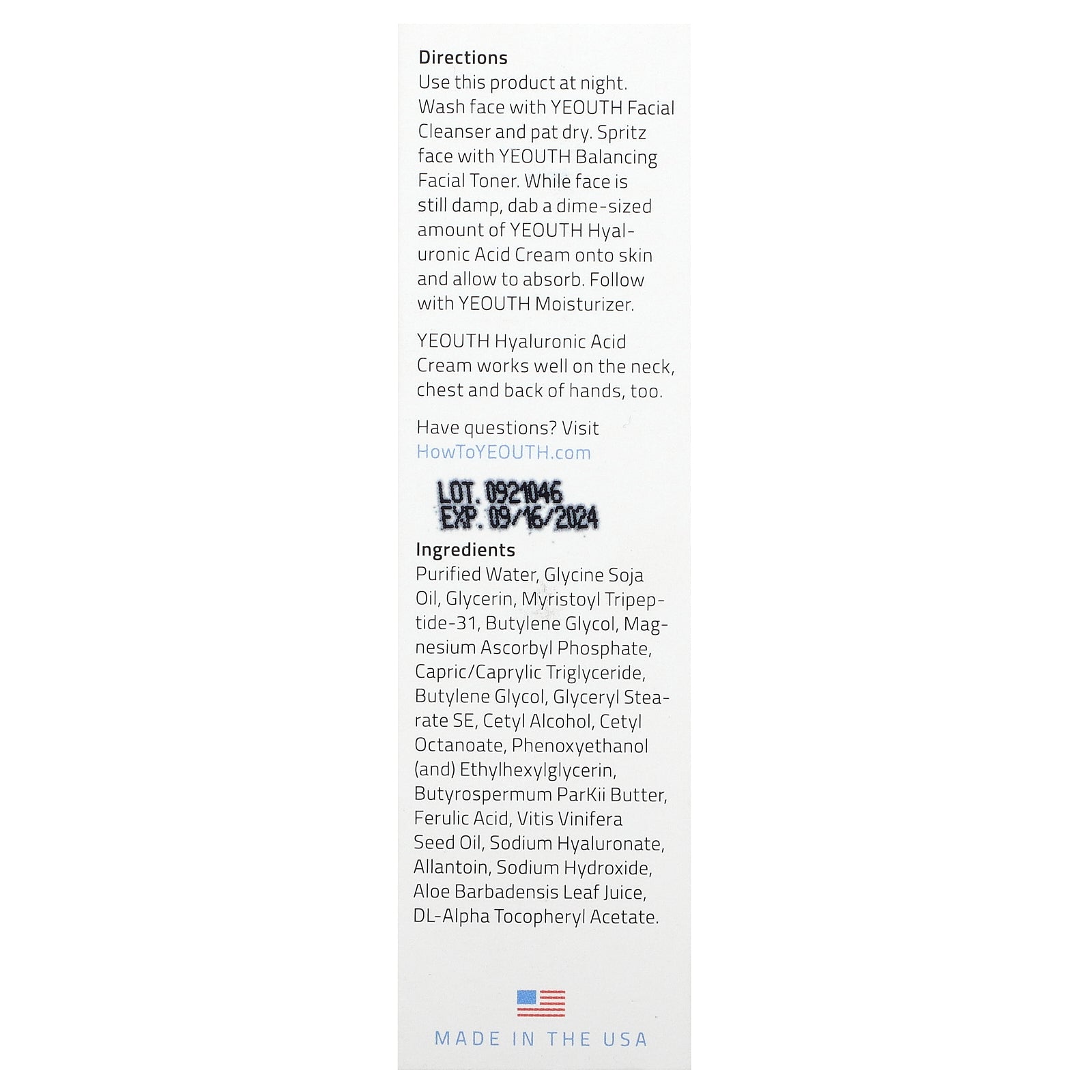 Use this product at night. Wash face with YEOUTH Facial Cleanser and pat dry. Spritz face with YEOUTH Balancing Facial Toner. While face is still damp, dab a dime-sized amount of YEOUTH Hyaluronic Acid Cream onto skin and allow to absorb. Follow with YEOUTH Moisturizer.