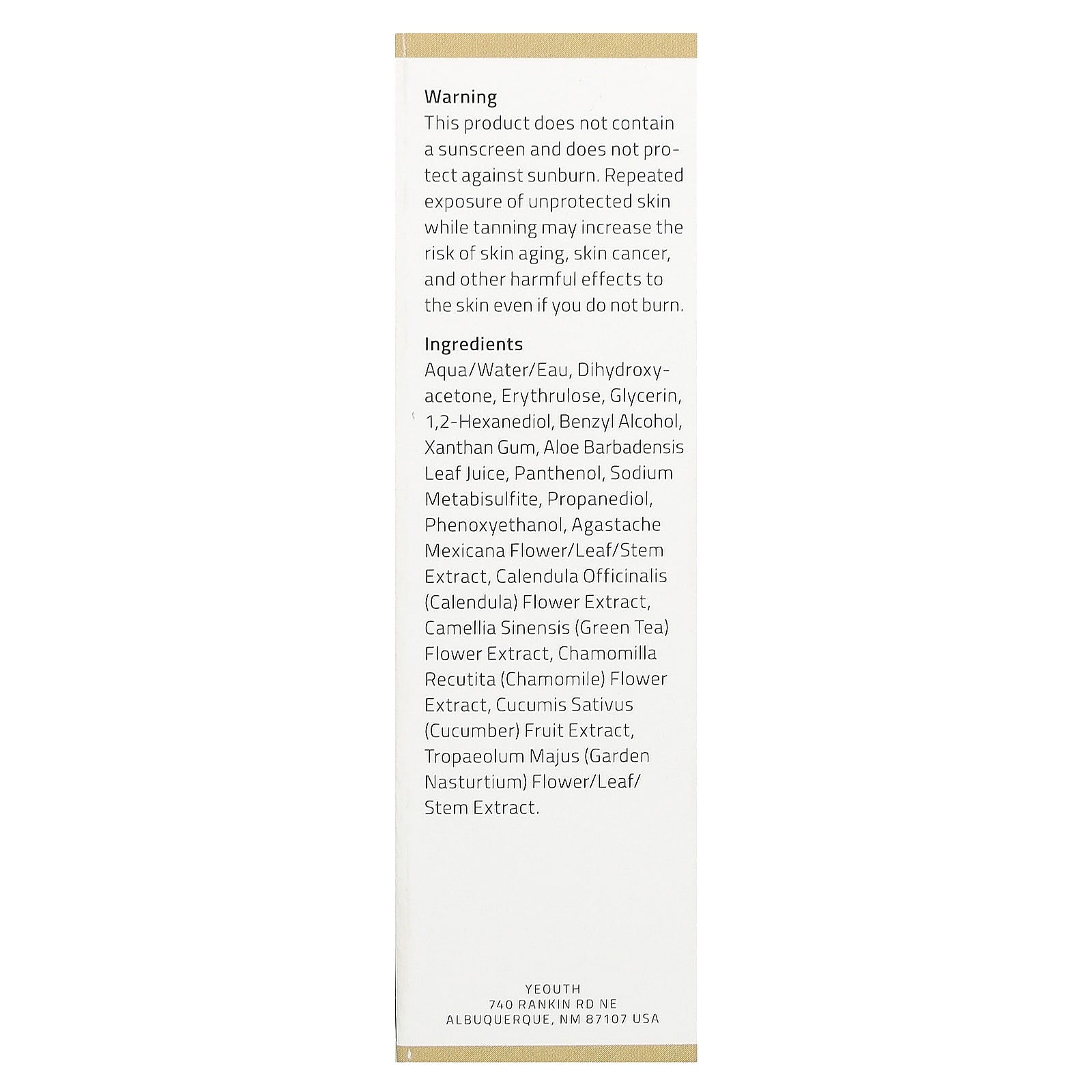 Aqua/water/eau, dihydroxyacetone, erythrulose, glycerin, 1,2-hexanediol, benzyl alcohol, xanthan gum, aloe barbadensis leaf juice, panthenol, sodium metabisulfite, propanediol, phenoxyethanol, agastache mexicana flower/leaf/stem extract, calendula officinalis (calendula) flower extract, camellia sinensis (green tea) flower extract, chamomilla recutita (chamomile) flower extract, cucumis sativus (cucumber) fruit extract, tropaeolum majus (garden nasturtium) flower/leaf/ stem extract.