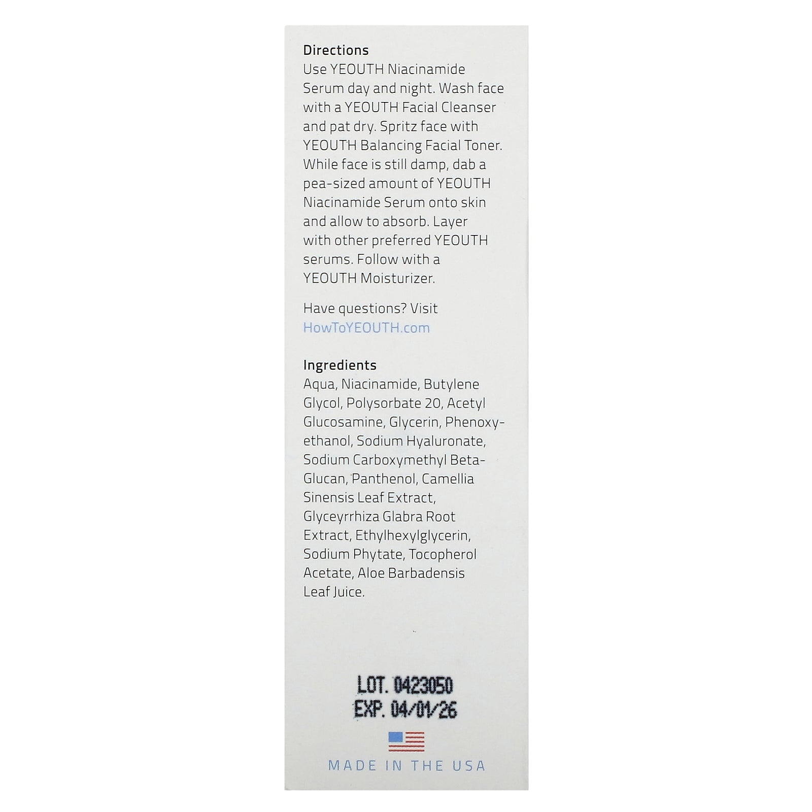 Use Yeouth Niacinamide Serum day and night. Wash face with a Yeouth Facial Cleanser and pat dry. Spritz face with Yeouth Balancing Facial Toner. While face is still damp, dab a pea-sized amount of Yeouth Niacinamide Serum onto skin and allow to absorb. Layer with other preferred Yeouth serums. Follow with a Yeouth Moisturizer.