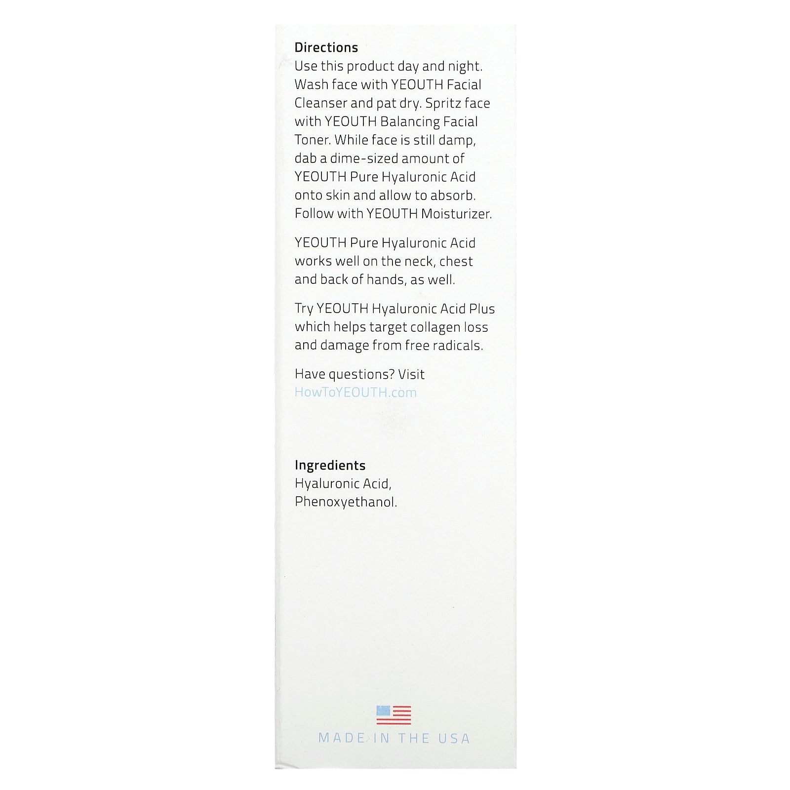 Use this product day and night. Wash face with Yeouth Facial Cleanser and pat dry. Spritz face with YEOUTH Balancing Facial Toner. While face is still damp, dab a dime-sized amount of Yeouth Pure Hyaluronic Acid onto skin and allow to absorb. Follow with Yeouth Moisturizer.