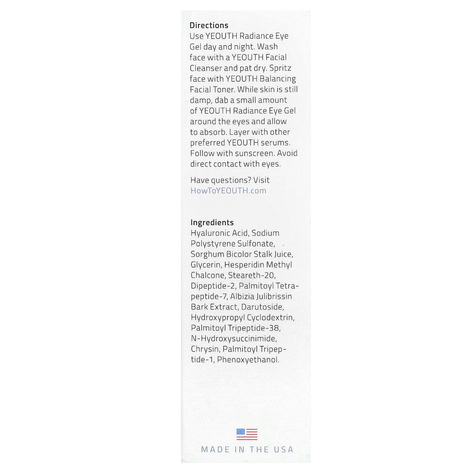 Use YEOUTH Radiance Eye Gel day and night. Wash face with a YEOUTH Facial Cleanser and pat dry. Spritz face with YEOUTH Balancing Facial Toner. While skin is still damp, dab a small amount of YEOUTH Radiance Eye Gel around the eyes and allow to absorb. Layer with other preferred YEOUTH serums. Follow with sunscreen.