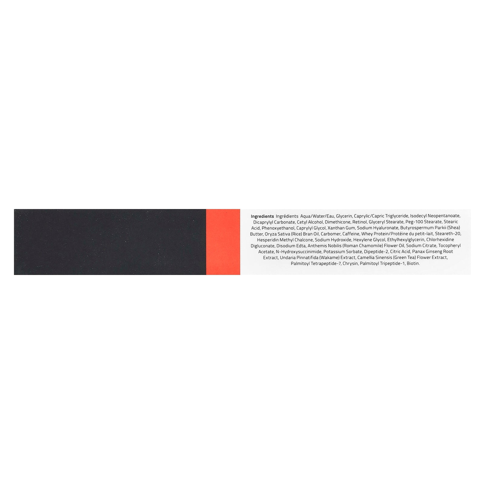 Aqua/water/eau, glycerin, caprylic/capric triglyceride, isodecyl neopentanoate, dicaprylyl carbonate, cetyl alcohol, dimethicone, retinol, glyceryl stearate, peg-100 stearate, stearic acid, phenoxyethanol, caprylyl glycol, xanthan gum, sodium hyaluronate, butyrospermum parkii (shea) butter, oryza sativa (rice) bran oil, carbomer, caffeine, whey protein/protéine du petit-lait, steareth-20, hesperidin methyl chalcone, sodium hydroxide, hexylene glycol, ethylhexylglycerin, chlorhexidine digluconate, disodium edta, anthemis nobilis (roman chamomile) flower oil, sodium citrate, tocopheryl acetate, n-hydroxysuccinimide, potassium sorbate, dipeptide-2, citric acid, panax ginseng root extract, undaria pinnatifida (wakame) extract, camellia sinensis (green tea) flower extract, palmitoyl tetrapeptide-7, chrysin, palmitoyl tripeptide-1, biotin.