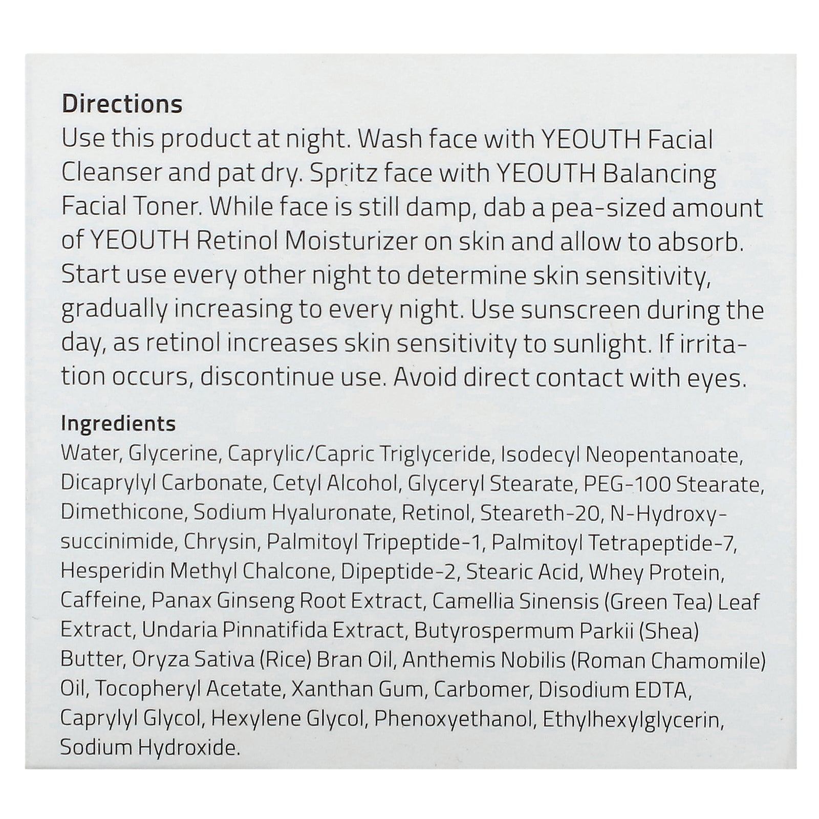 Use this product at night. Wash face with Yeouth Facial Cleanser and pat dry. Spritz face with Yeouth Balancing Facial Toner. While face is still damp, dab a pea-sized amount of Yeouth Retinol Moisturizer on skin and allow to absorb. Start use every other night to determine skin sensitivity, gradually increasing to every night. Use sunscreen during the day, as retinol increases skin sensitivity to sunlight.