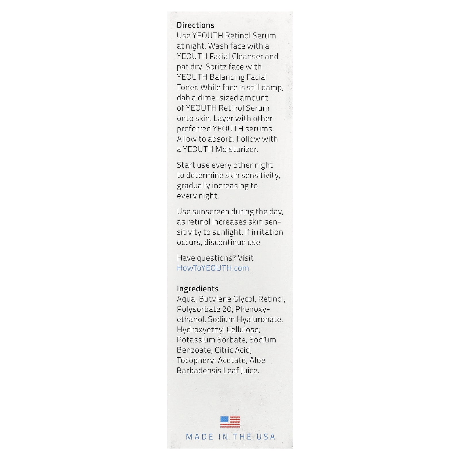 Use YEOUTH Retinol Serum at night. Wash face with a YEOUTH Facial Cleanser and pat dry. Spritz face with YEOUTH Balancing Facial Toner. While face is still damp, dab a dime-sized amount of YEOUTH Retinol Serum onto skin. Layer with other preferred YEOUTH serums. Allow to absorb. Follow with a YEOUTH Moisturizer.