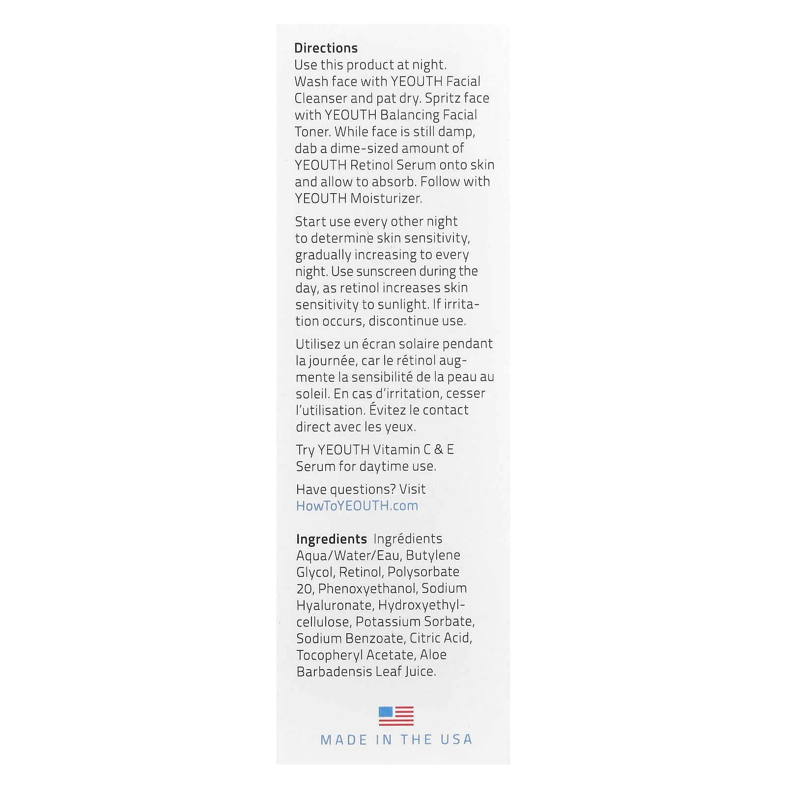 Use this product at night. Wash face with YEOUTH Facial Cleanser and pat dry. Spritz face with YEOUTH Balancing Facial Toner. While face is still damp, dab a dime-sized amount of YEOUTH Retinol Serum onto skin and allow to absorb. Follow with YEOUTH Moisturizer.