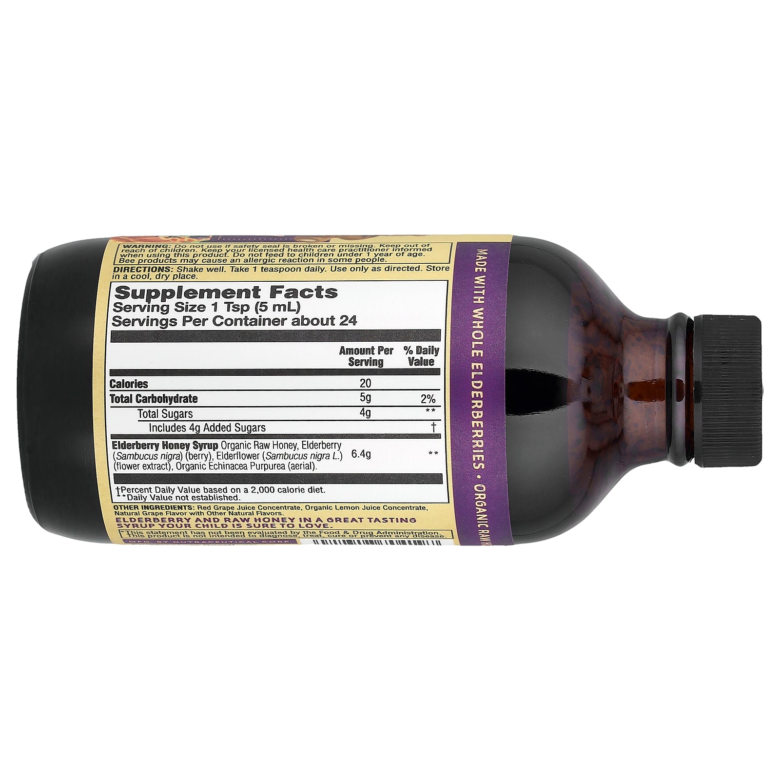 | Elderberry Honey Syrup Organic Raw Honey, Elderberry (Sambucus nigra) (berry), Elderflower (Sambucus nigra L.) (flower extract), Organic Echinacea Purpurea (aerial). | 6.4 g | ** |