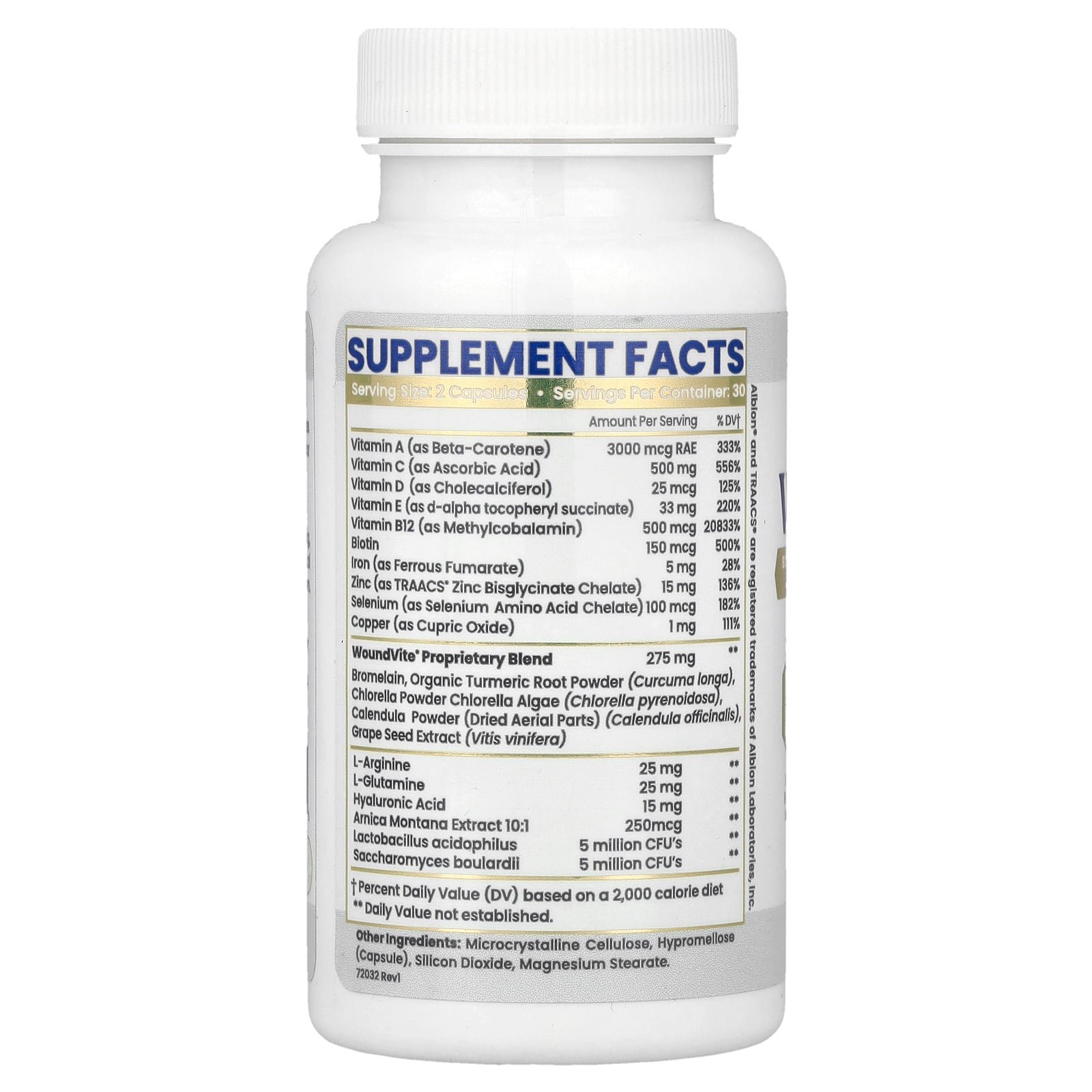 | WoundVite® Proprietary Blend Bromelain, Organic Turmeric Root Powder (Curcuma longa), Chlorella Powder Chlorella Algae (Chlorella pyrenoidosa), Calendula Powder (Dried Aerial Parts) (Calendula officinalis), Grape Seed Extract (Vitis Vinifera) |