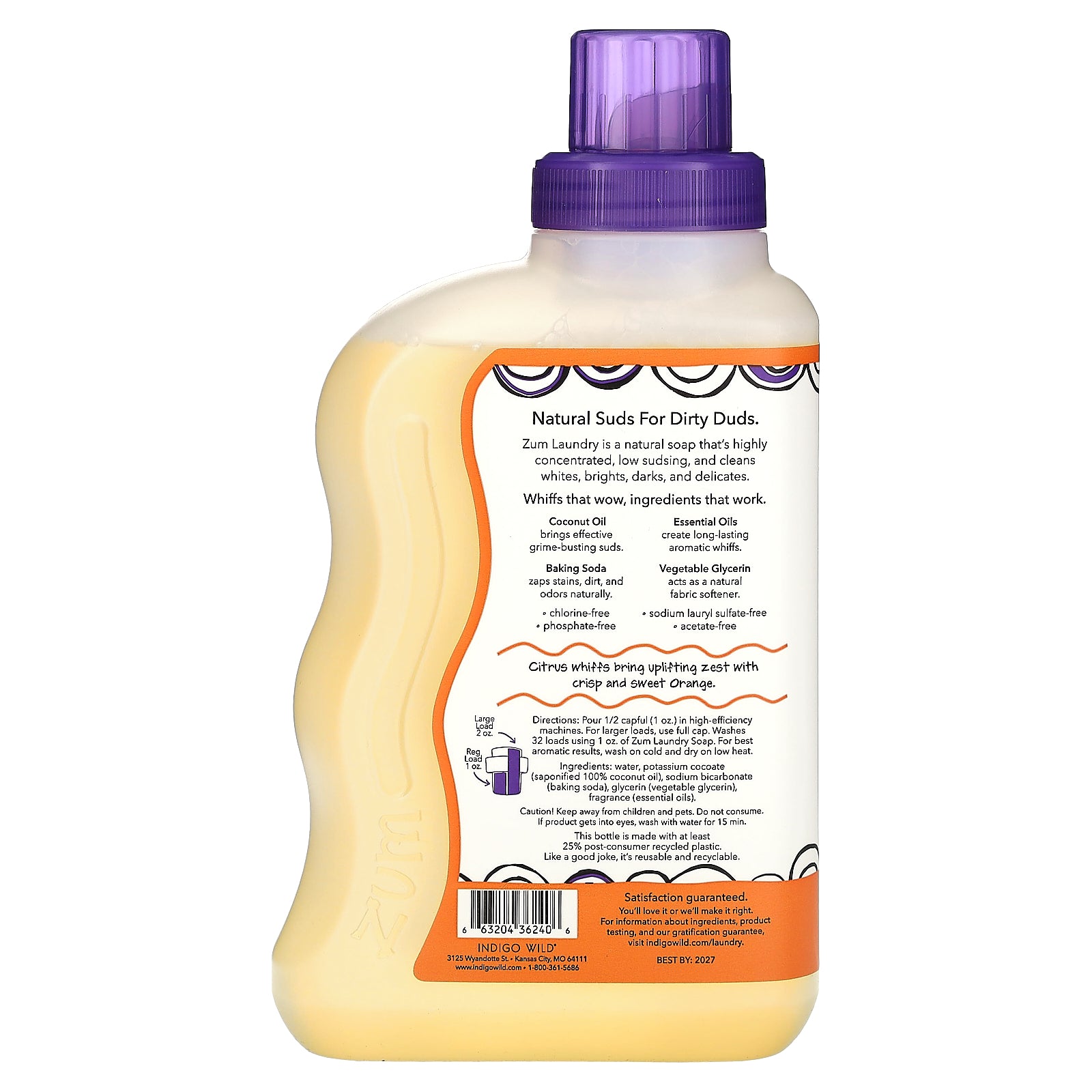 Pour ½ capful (1 oz.) in high-efficiency machines. For larger loads, use full cap. Washes 32 loads using 1 oz. of Zum Laundry Soap. For best aromatic results, wash on cold and dry on low heat.